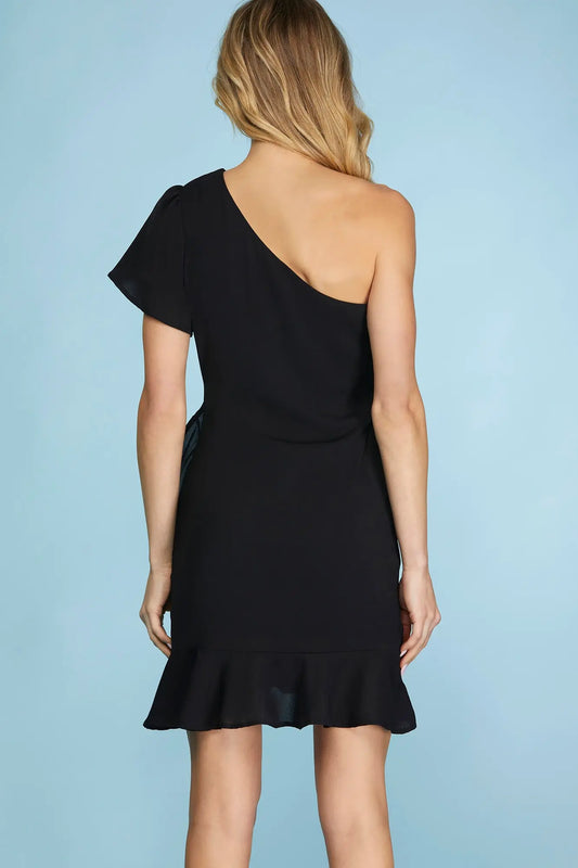 • Floral Puff Sleeve Faux Leather Hem Dress