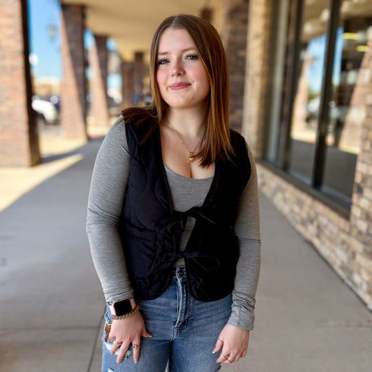 Black Front Bow Ruffle Sleeve Puffer Vest