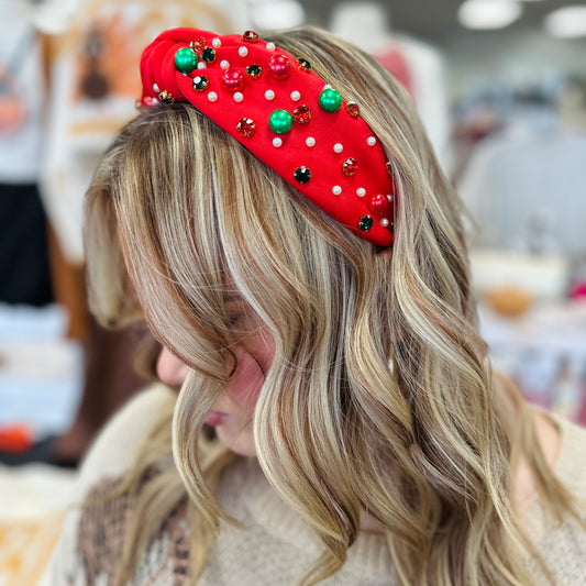 Christmas Pearl & Rhinestone Headband (Red & Green)