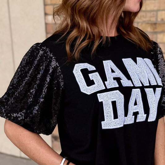 Game Day Sequin Bubble Sleeve Top-Black