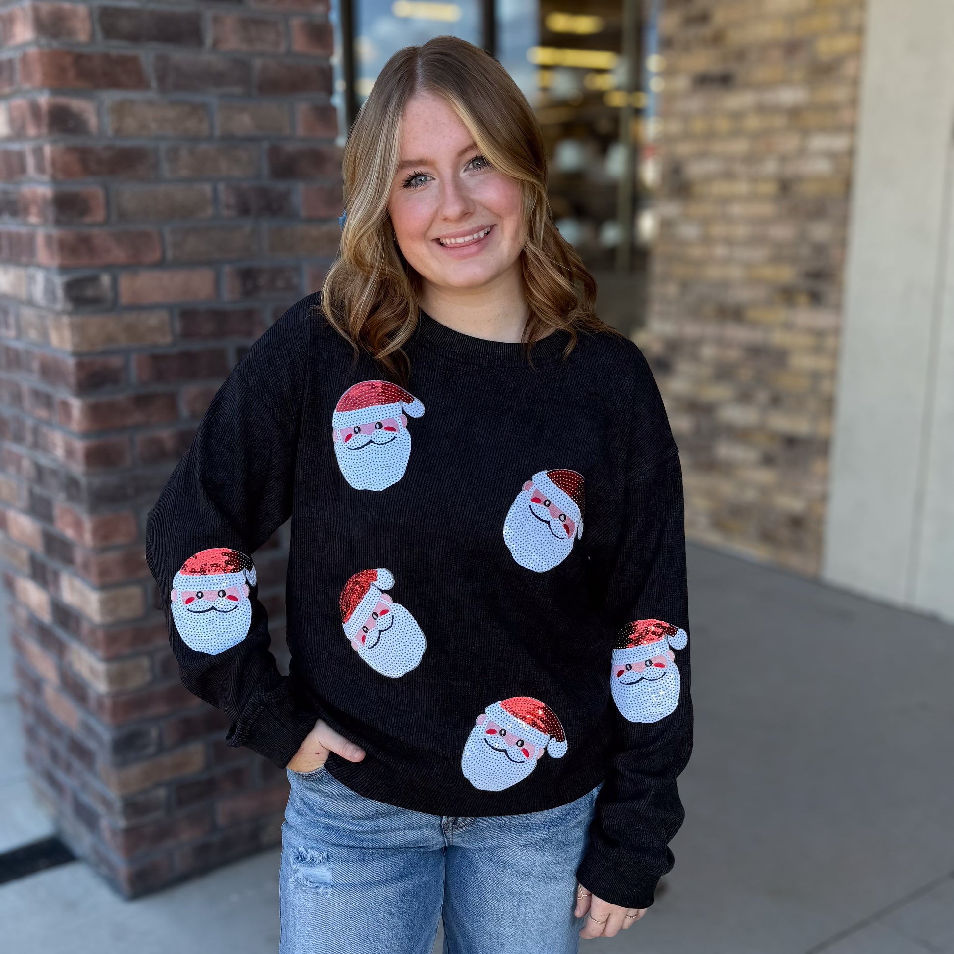 Spread Christmas magic in this ribbed long sleeve top featuring adorable sequin Santas dancing across the front! The shimmering sequin details catch the light beautifully, adding a touch of holiday glamour to your seasonal wardrobe. Ribbed fabric provides a comfortable, flattering fit that works for festive parties, casual gatherings, or cozy nights in. Whether you're channeling your inner elf or just embracing the jolly spirit, this playful top brings instant cheer and sparkle to any Christmas celebration. A fun way to show your holiday enthusiasm!
