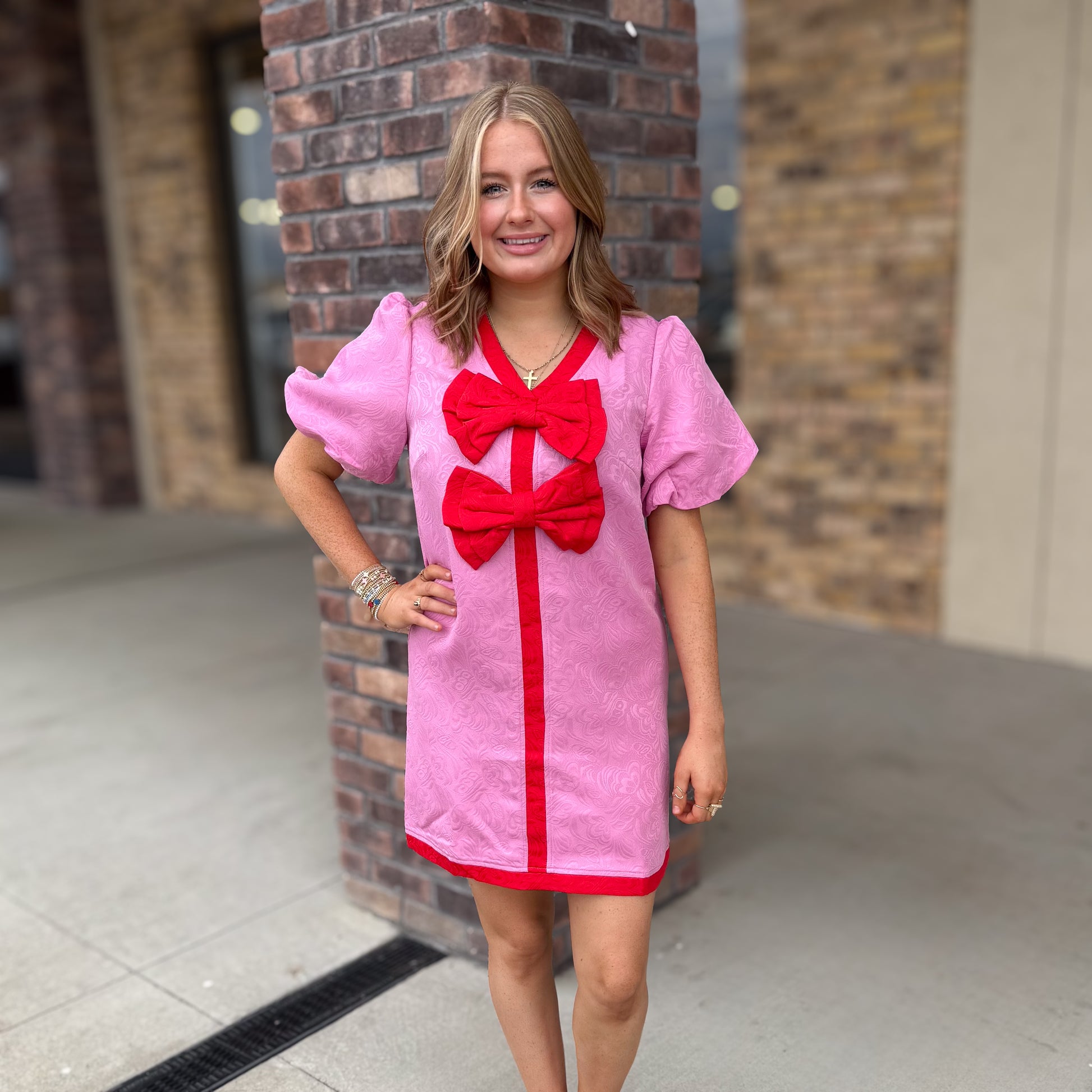 Make a statement this holiday season in this stunning dressy dress designed to turn heads. Crafted from luxurious abstract jacquard woven fabric, it features charming short bubble sleeves and an eye-catching double front bow detail that adds instant elegance. The back invisible zipper closure ensures a seamless silhouette, while solid placket and hem details provide polished finishing touches. Perfect for festive celebrations, this dress combines sophisticated style with standout flair—because you deserve to feel absolutely radiant.