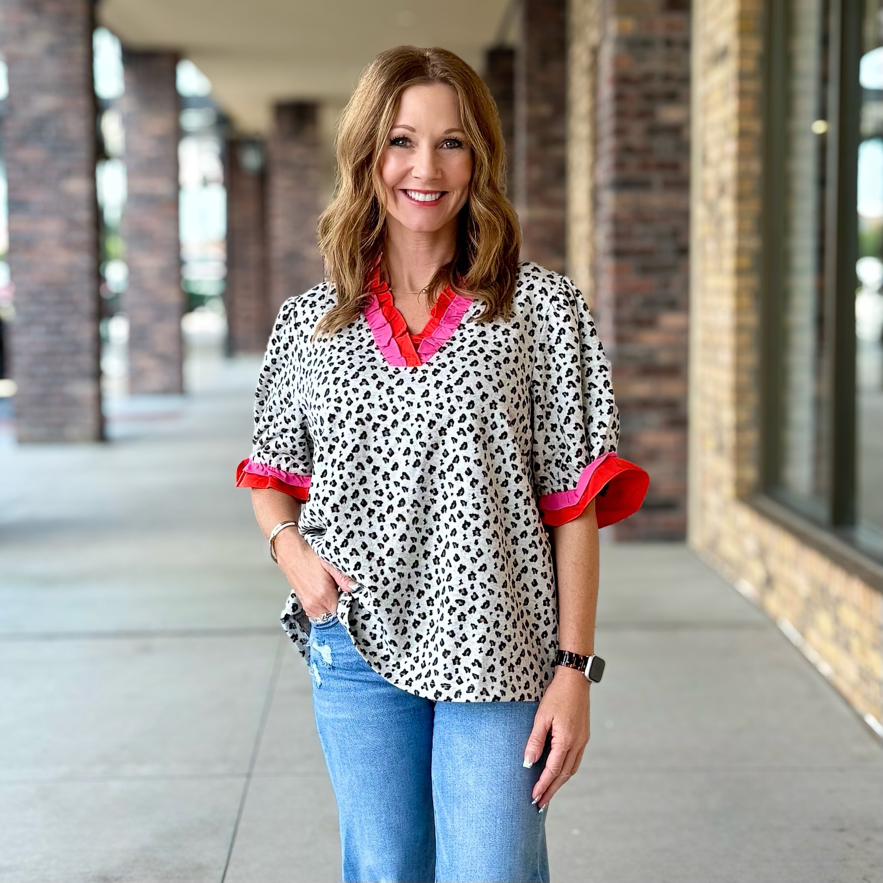This stylish leopard print top features a flattering deep V-neckline and charming short puff sleeves. Double ruffle detailing on the neck and cuffs adds a touch of feminine elegance, making it perfect for elevating your everyday look with subtle sophistication and comfort.