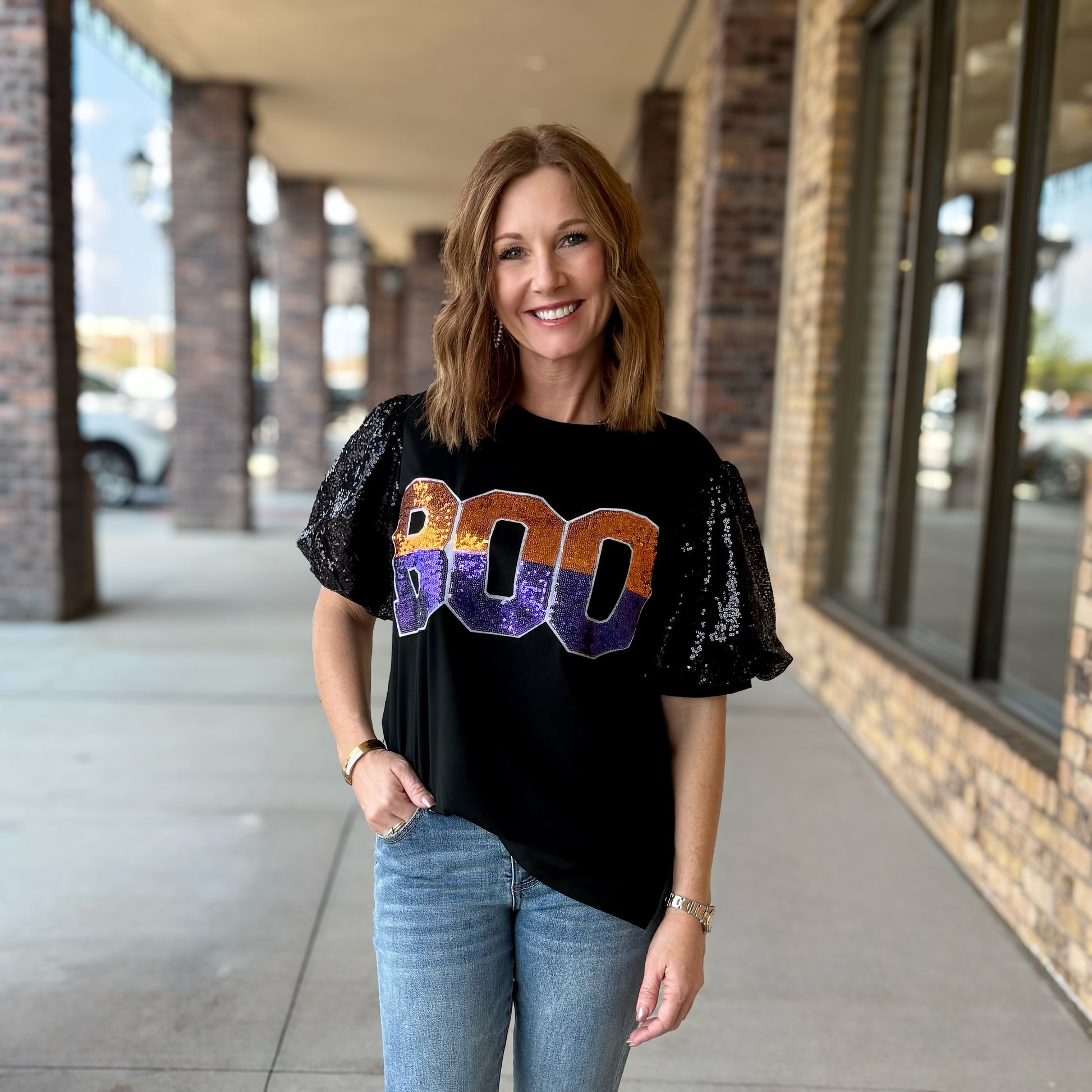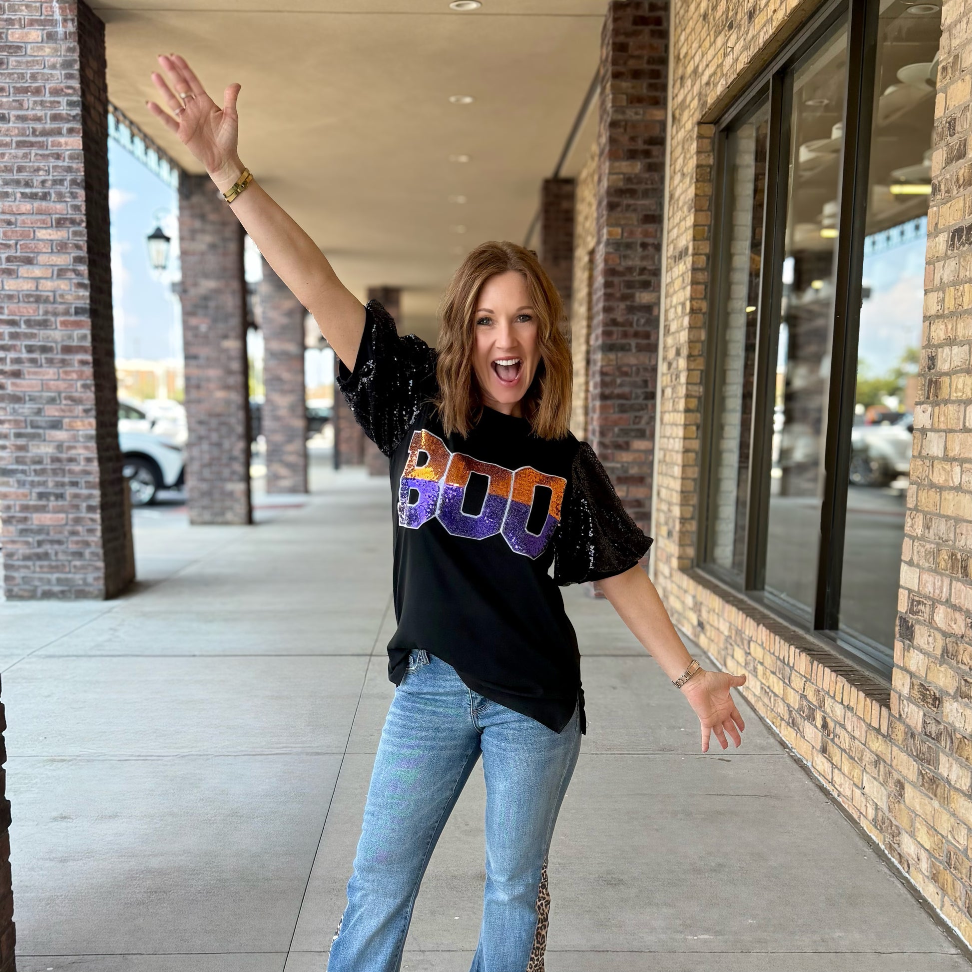 Elevate your October style with the BOO Sequin Puff Sleeve Top—an eye-catching piece that blends festive sparkle with bold elegance. Its dramatic puff sleeves and shimmering sequins make it the perfect statement for work or school, adding confidence and flair to your seasonal wardrobe. Stand out with every move you make this spooky season.