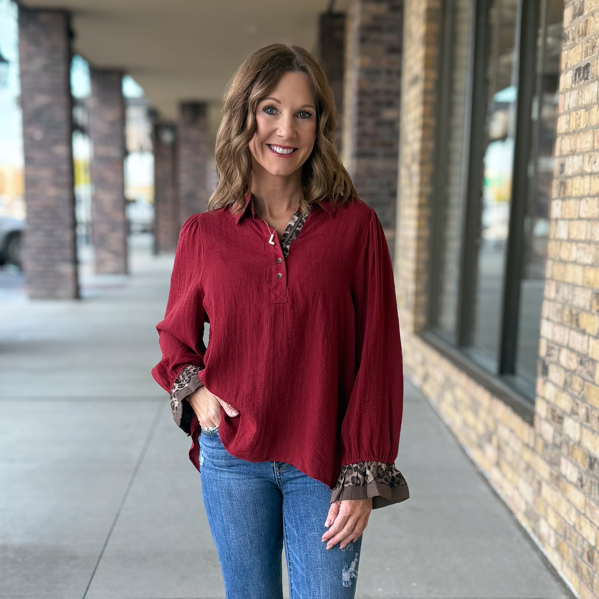 This elegant button-up blouse features refined 3/4 sleeves and subtle leopard print accents on the inner collar, placket, and sleeve cuffs. Its sophisticated design offers a perfect balance of classic style with a modern, unexpected touch, making it a versatile addition to any wardrobe. Available in Chocolate and Burgundy.