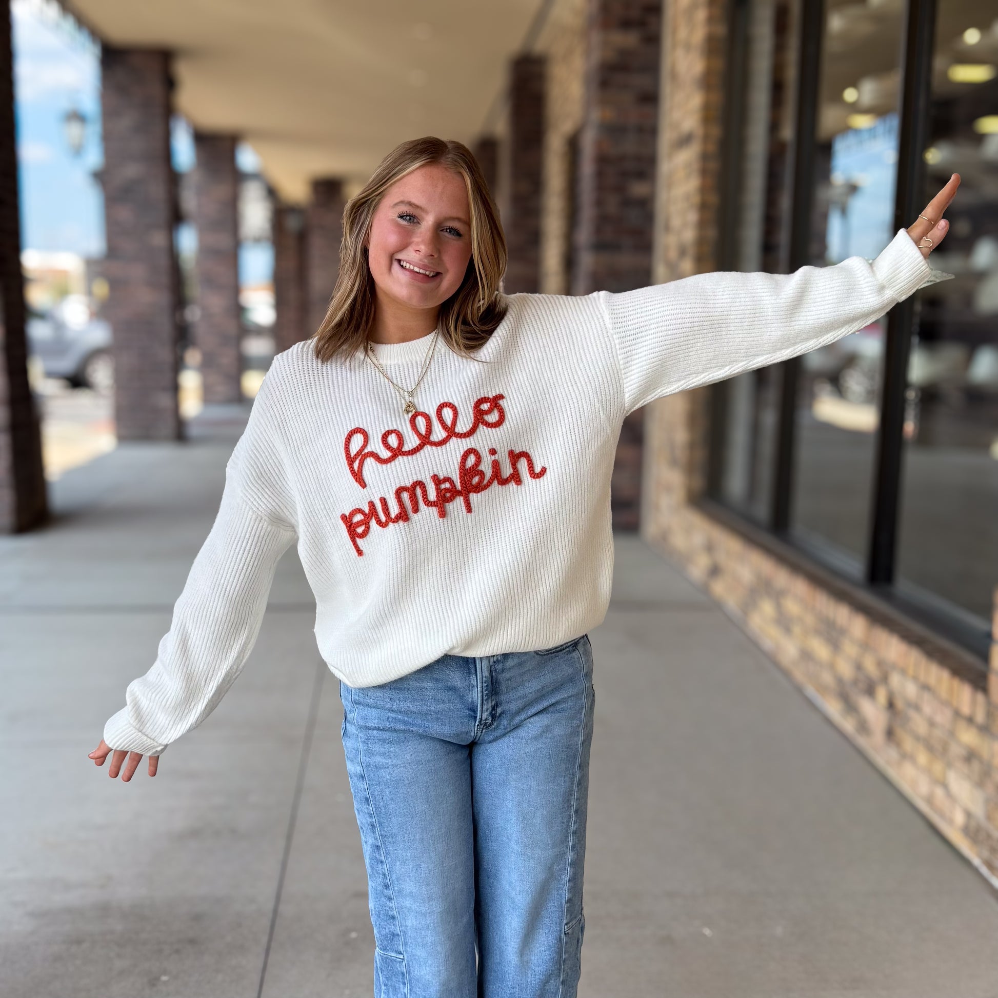 Embrace the season in the “Hello Pumpkin” cream knit sweater—your perfect holiday companion. Its irresistibly soft, cozy fabric wraps you in warmth while making a bold style statement. Celebrate festive vibes with daring comfort and effortless charm.