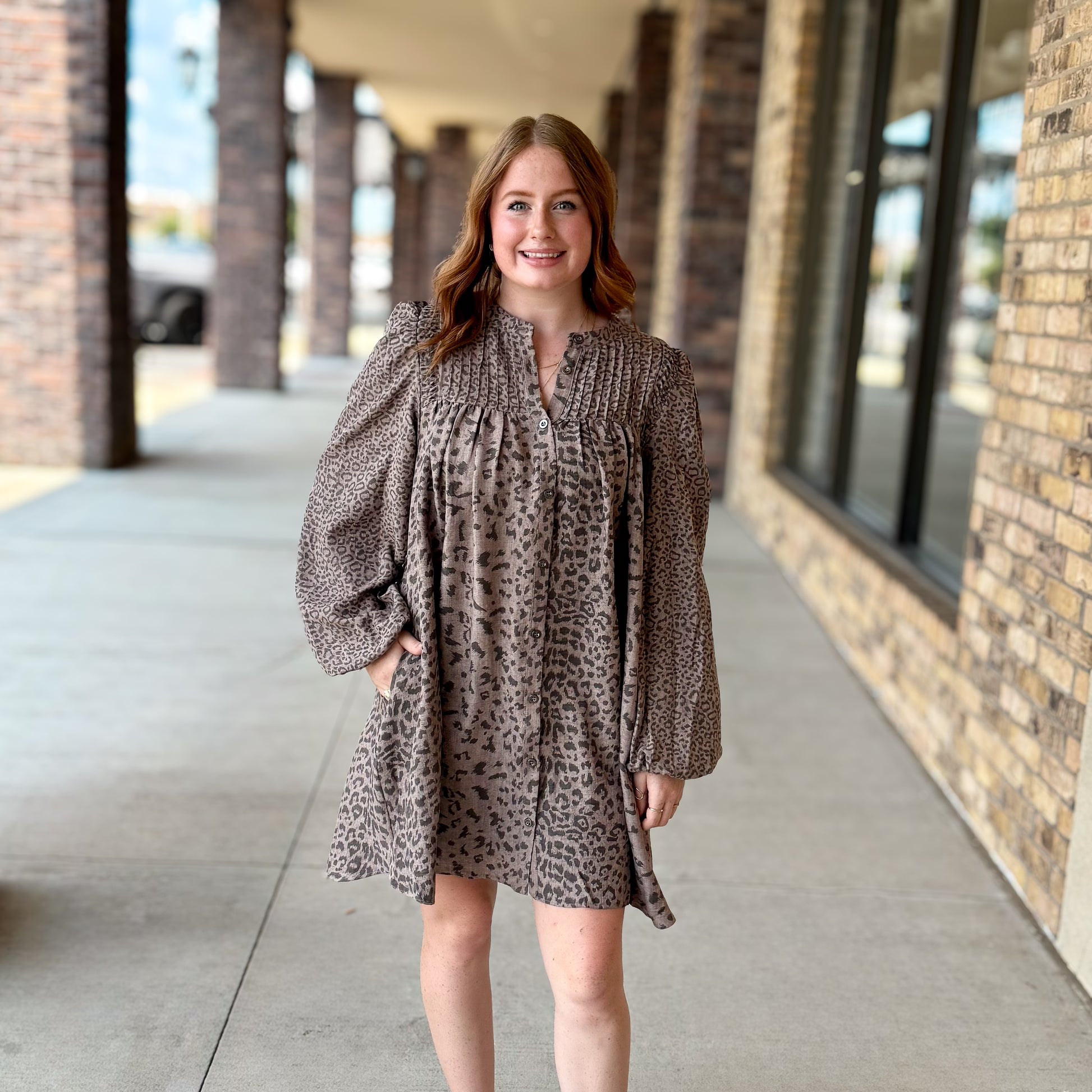 Embrace effortless style with this relaxed babydoll dress featuring an all-over leopard print that adds a bold touch. The front button-down closure and pintuck detailing enhance its chic appeal, while long balloon sleeves with gathered elastic cuffs offer comfort and movement. Practical side pockets and a curved high-low hemline complete the look, making it perfect for day-to-night wear.
