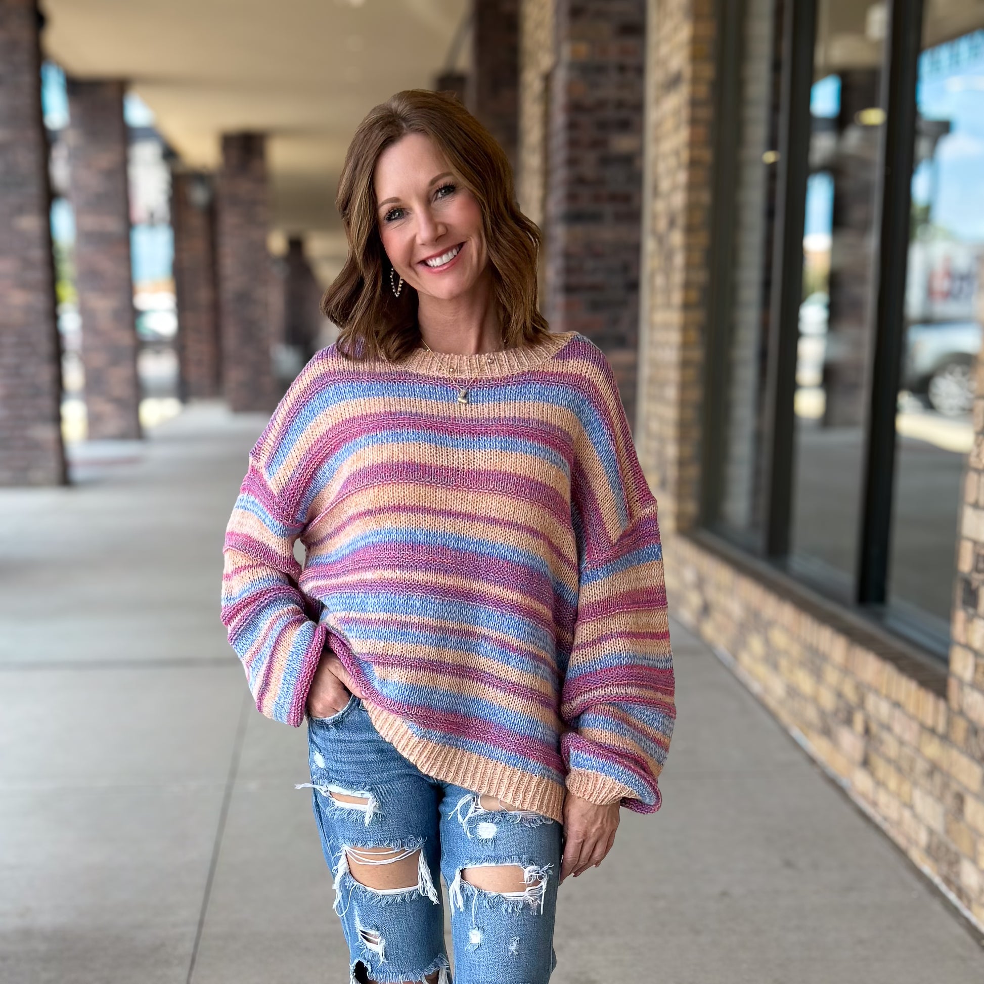 Experience cozy style with this multicolor knit sweater pullover featuring long balloon sleeves that add a chic, modern flair. Perfect for layering, its vibrant colors brighten any outfit while the comfortable knit fabric keeps you warm throughout your day. Elevate your wardrobe with this fashionable and versatile piece.