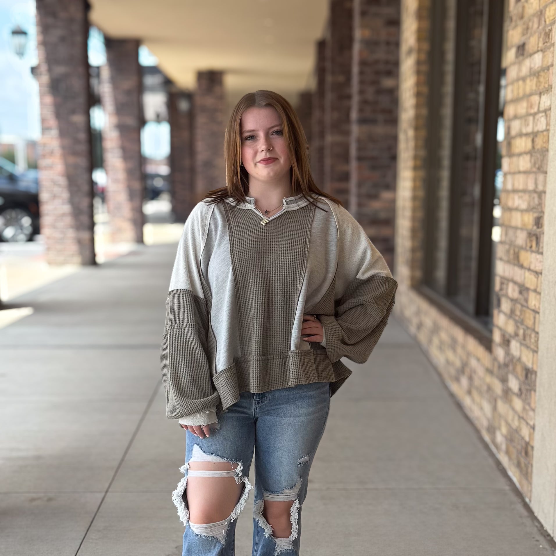 Stay cozy and cool in this oversized long sleeve top featuring a trendy raw hem and a unique thermal accent. Perfect for layering or lounging, its relaxed fit adds effortless style with a playful edge. Embrace comfort without sacrificing flair!