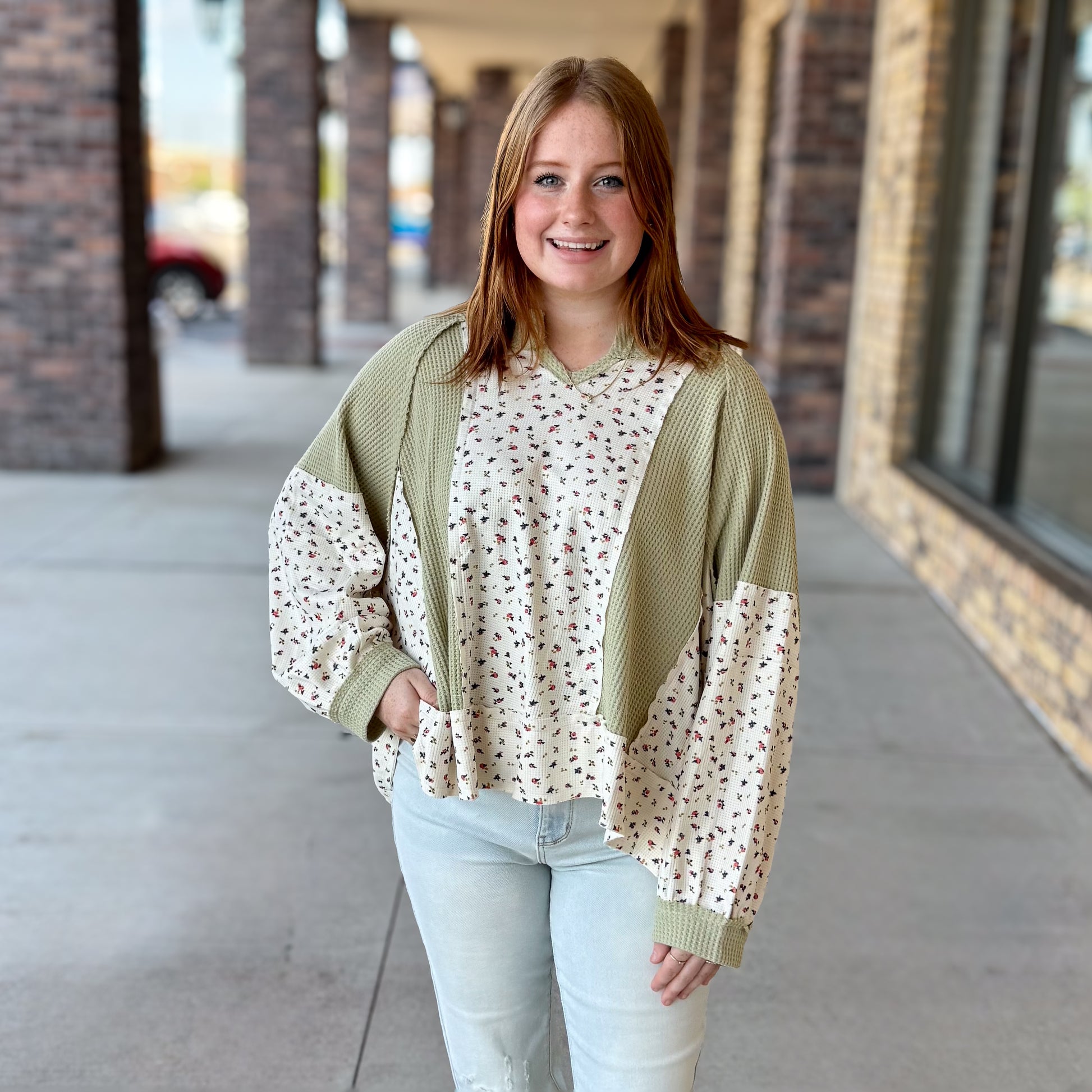 Designed in round neck, balloon sleeve, oversized fit top in thermal with raw edge detail pointed floral pattern.