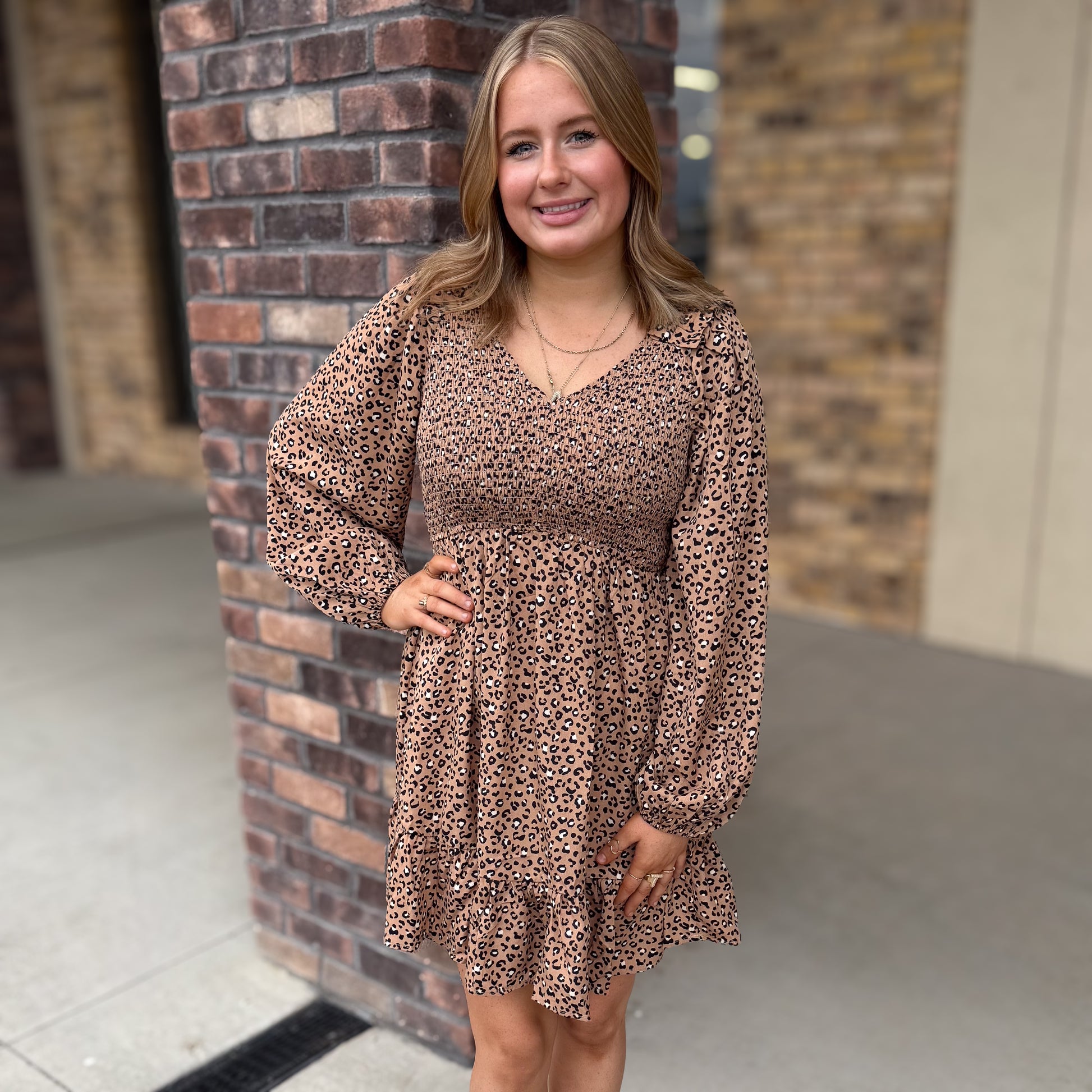 Unleash your wild side in the Falling For Leopard Dress. This fierce dress features a trendy leopard print, statement balloon sleeves, and flattering smocking. Pair it with tall boots for an effortlessly chic look.