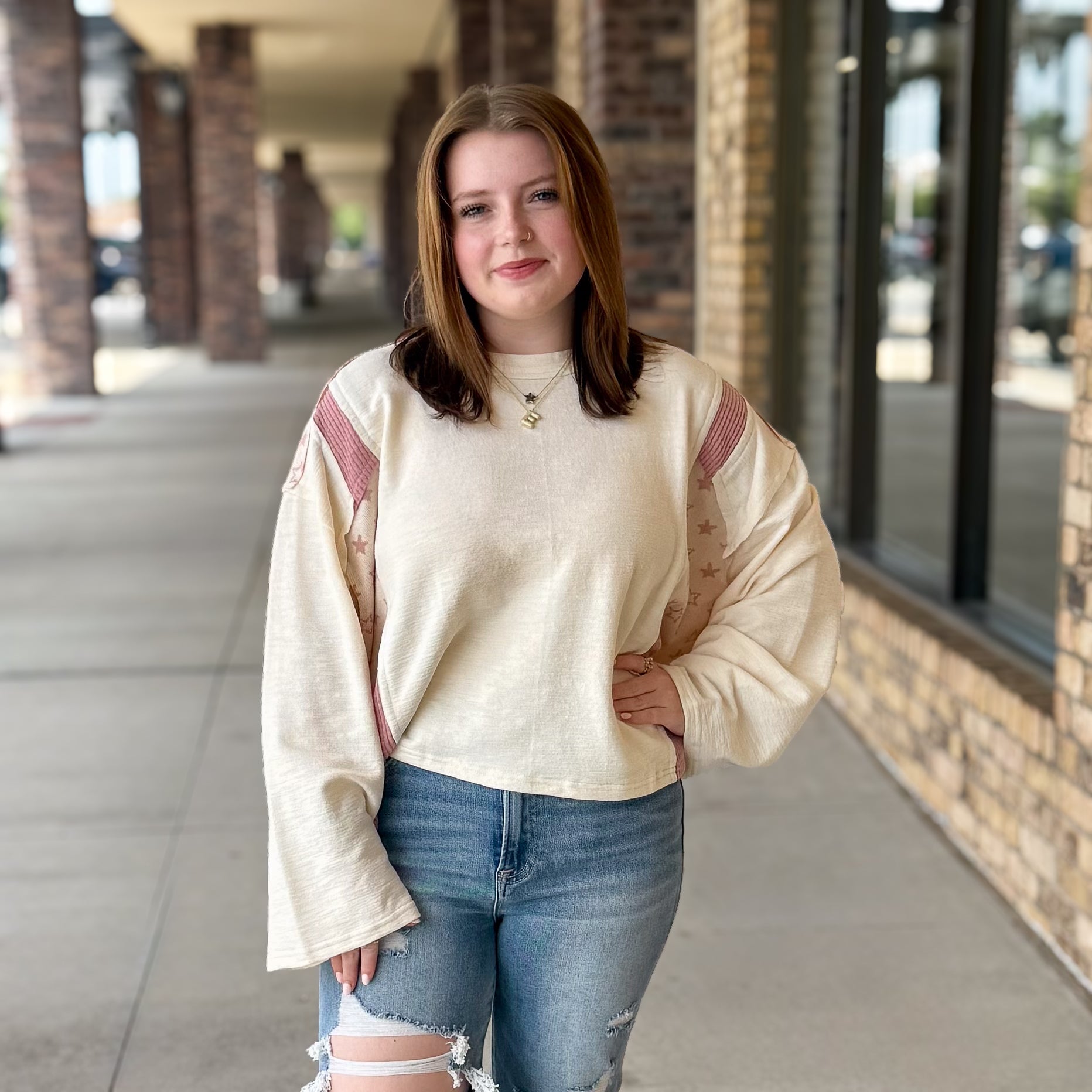 Experience comfort and style with this round neck, long sleeve top featuring a roomy fit for effortless wear. Crafted from textured knit fabric, it showcases a striking star pattern in contrasting colors, adding a playful yet chic touch to your wardrobe. This versatile piece combines cozy warmth with eye-catching design.