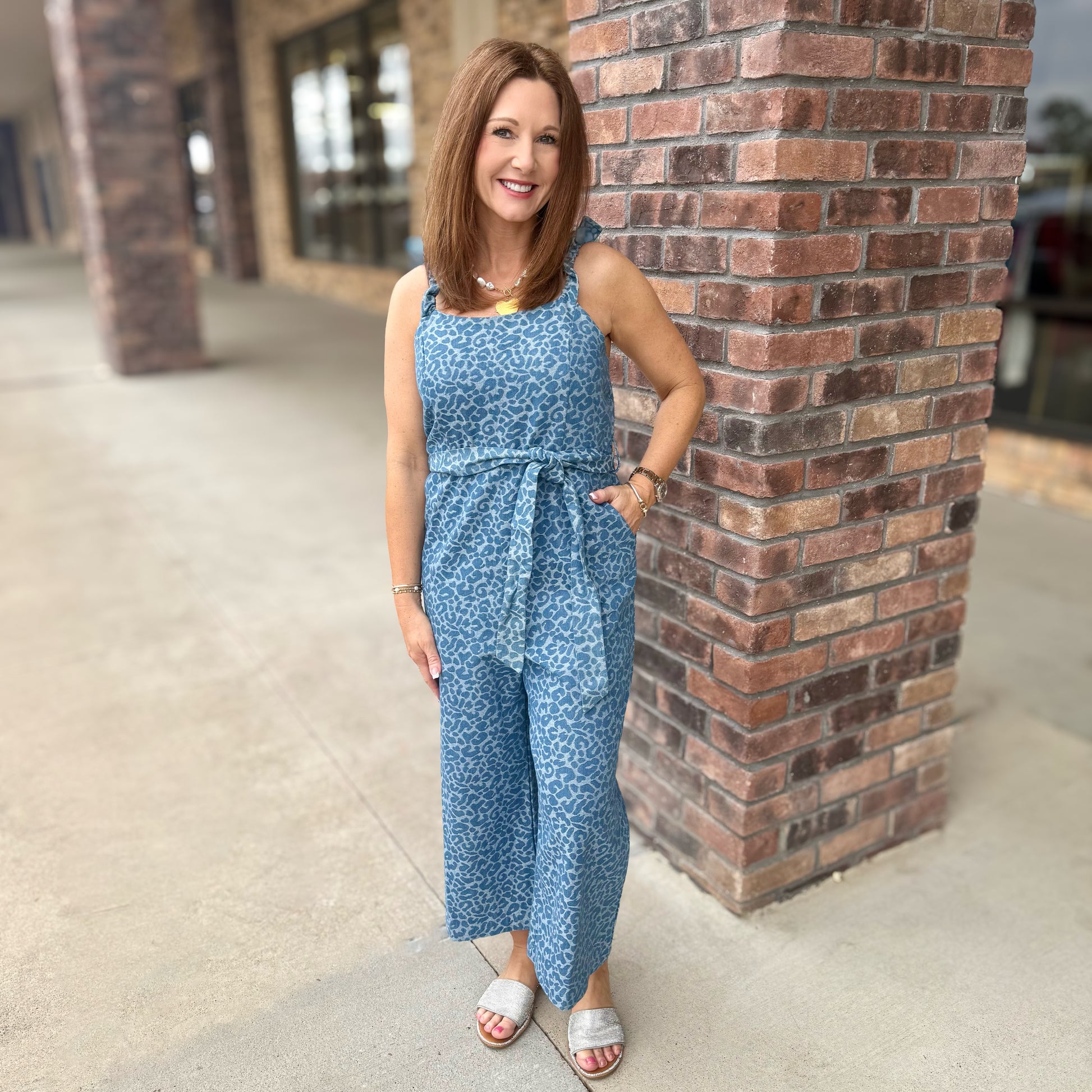 This denim overall showcases a sophisticated leopard print pattern paired with refined scalloped edge straps that elevate the classic silhouette. Crafted from quality denim, the piece balances contemporary animal print styling with thoughtful design details. The scalloped strap edges provide visual interest and a polished finish, while the overall construction ensures durability and comfort. An excellent choice for those seeking a statement piece that transitions seamlessly from casual to styled occasions, offering both versatility and distinctive character to any wardrobe.