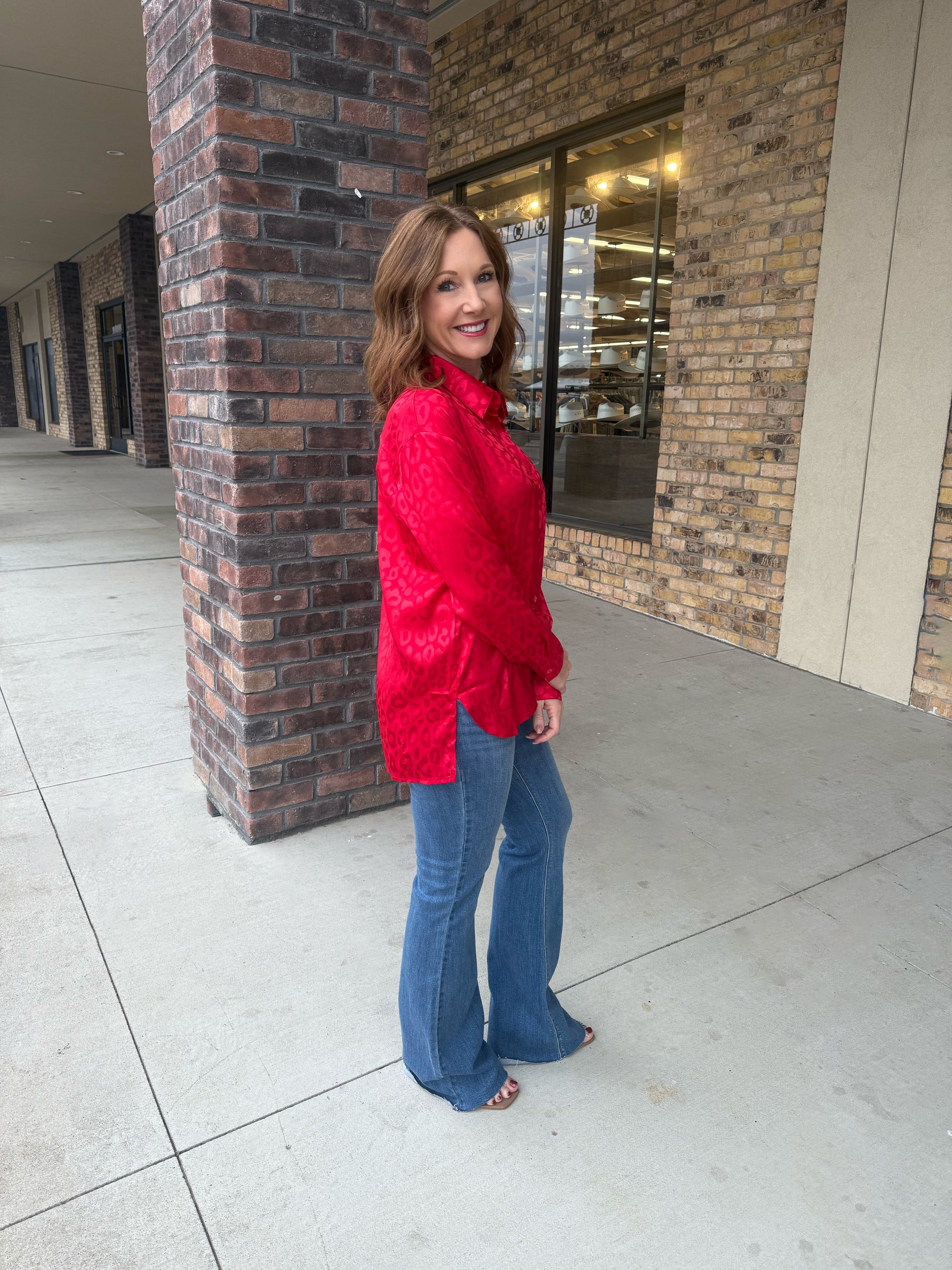 The Umgee Animal Jacquard Print Button Up Long Sleeve Top features a sophisticated jacquard animal pattern that adds texture and visual interest. Designed with a classic button-up front, a convenient chest pocket, and subtle side slits, it offers both style and comfort. This versatile piece can be dressed up for a polished look or worn casually for everyday ease, making it a valuable addition to any wardrobe. Available in Black, Champagne and Red.
