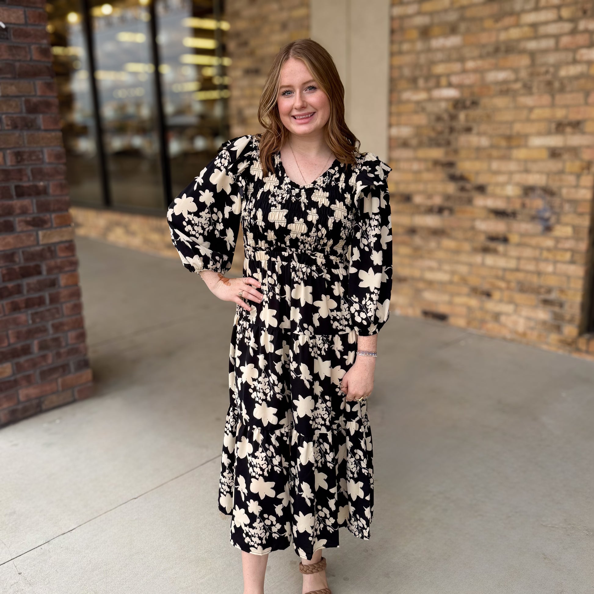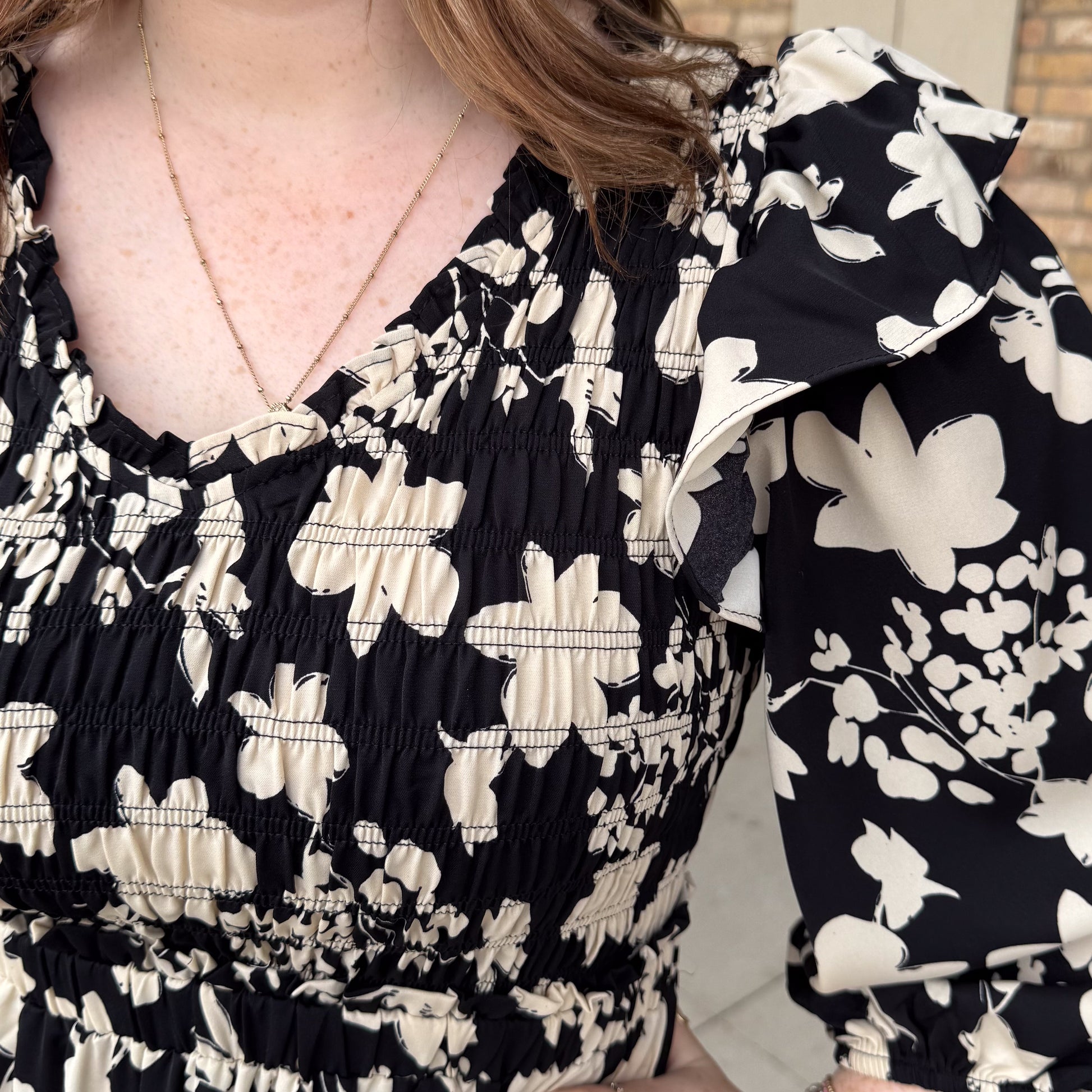 This Umgee midi dress features a flattering V-neck and delicate smocking for a comfortable yet polished fit. The subtle ruffle accent on the sleeves adds a refined detail, perfect for elevating your look whether at church, work, or upcoming holiday gatherings. Crafted for versatility, it blends classic style with modern touches to keep you looking elegant in any setting.