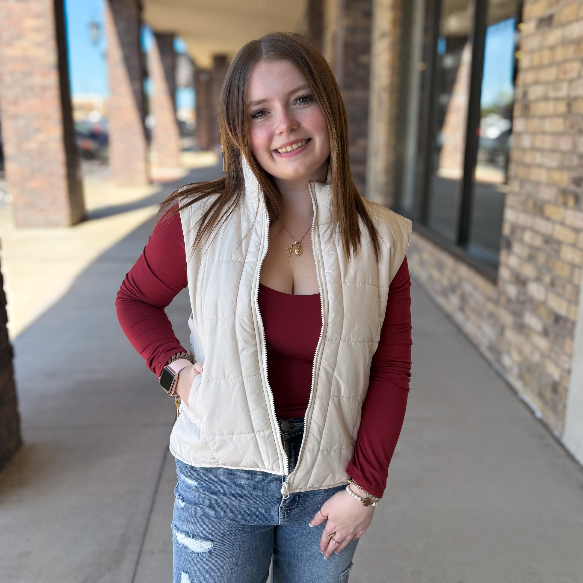 Introducing Your Daily Ecru Puffer Vest - the perfect addition to your fall wardrobe. True to size and crafted for effortless layering, this puffer vest will keep you stylish and comfortable. A must-have for any fashion-forward individual.