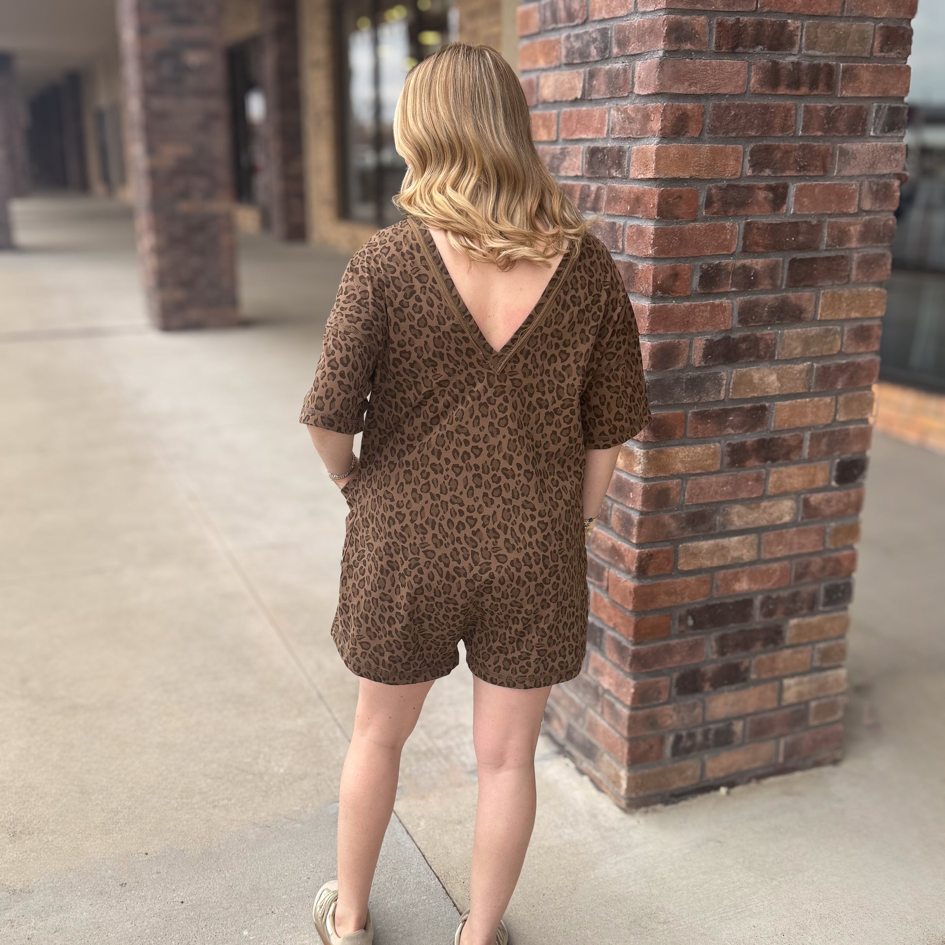 Get ready to turn heads in this leopard-printed knit romper that screams confidence and comfort. The cozy knit fabric feels amazing against your skin, while the round neckline and short sleeves keep you breezy and cool. Handy front pockets let you keep your phone and keys close by, and that flirty open back? Total showstopper. Whether you're lounging with friends or making a casual statement, this romper delivers style without the fuss.