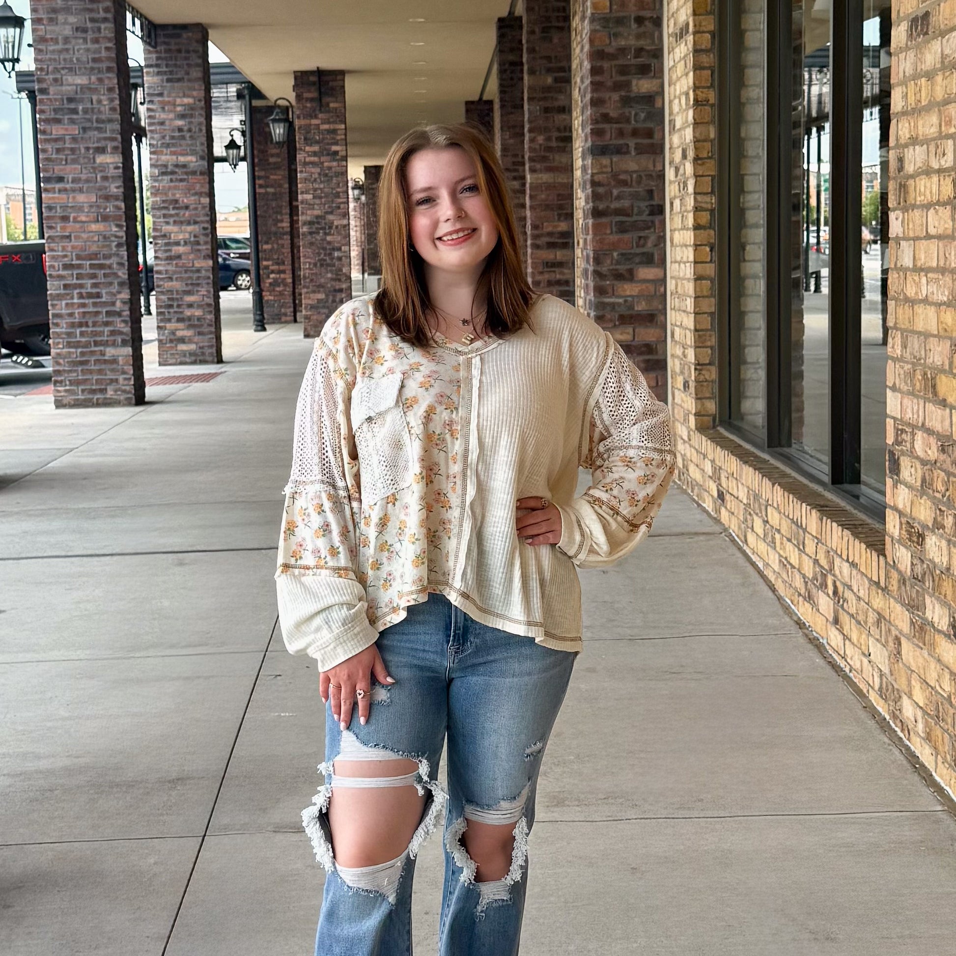 Get ready to turn heads with this V-neck long sleeve top! Crafted from soft ribbed jersey, its roomy fit keeps you comfy while the contrast fabric paneling adds a fun pop of style. The sweet floral accent brings a touch of charm that’s perfect for brightening up any outfit. Cozy, cute, and ready for anything—just remember, colors may vary a bit depending on your screen and lighting!