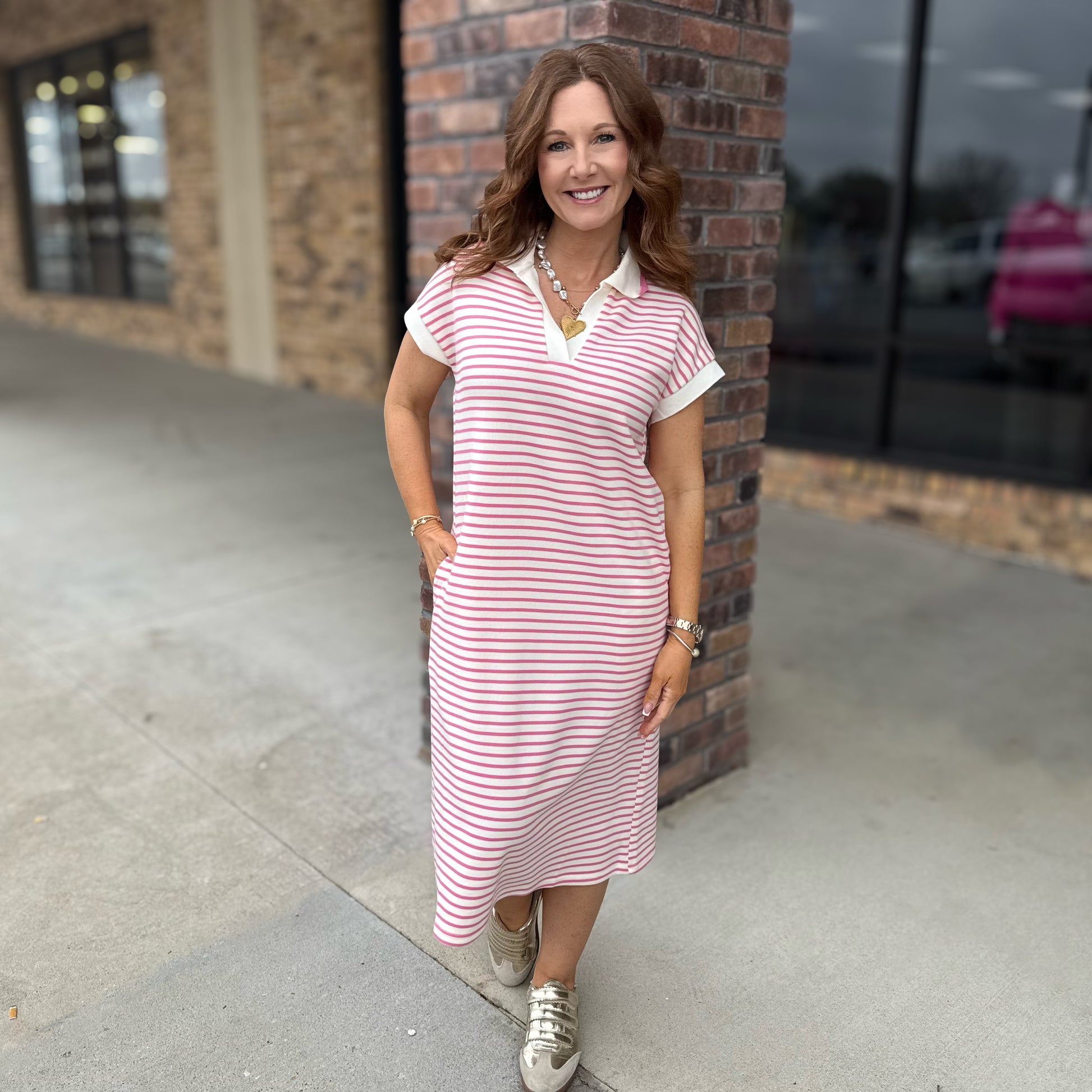 Stripes meet sophistication in this charming midi dress that effortlessly transitions from brunch to dinner. The crisp collared neckline and short sleeves keep things fresh, while the lightweight knit fabric drapes beautifully without weighing you down. Best part? Functional pockets mean you can actually carry your essentials. Whether you're dressing it up with heels or keeping it casual with sneakers, this striped stunner proves that versatility never goes out of style.