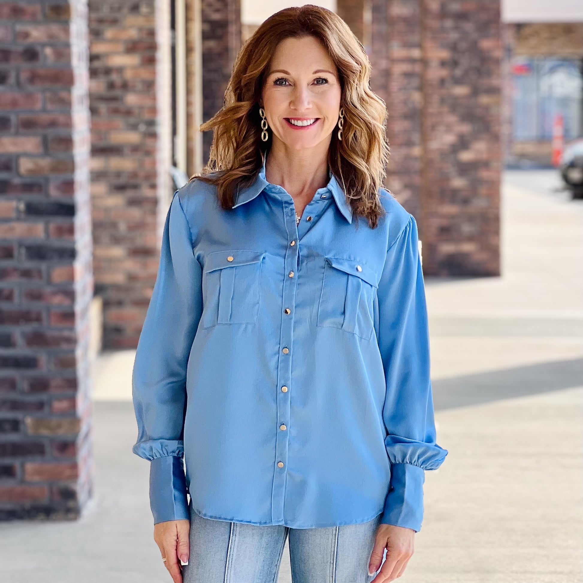 Elevate your style with the Metallic Blue Hue blouse. Crafted with a beautiful spring blue hue, this blouse features a timeless button-up design and delicate button accents for a touch of sophistication. Perfect for both business and casual occasions, it's a versatile piece that exudes elegance and refinement.