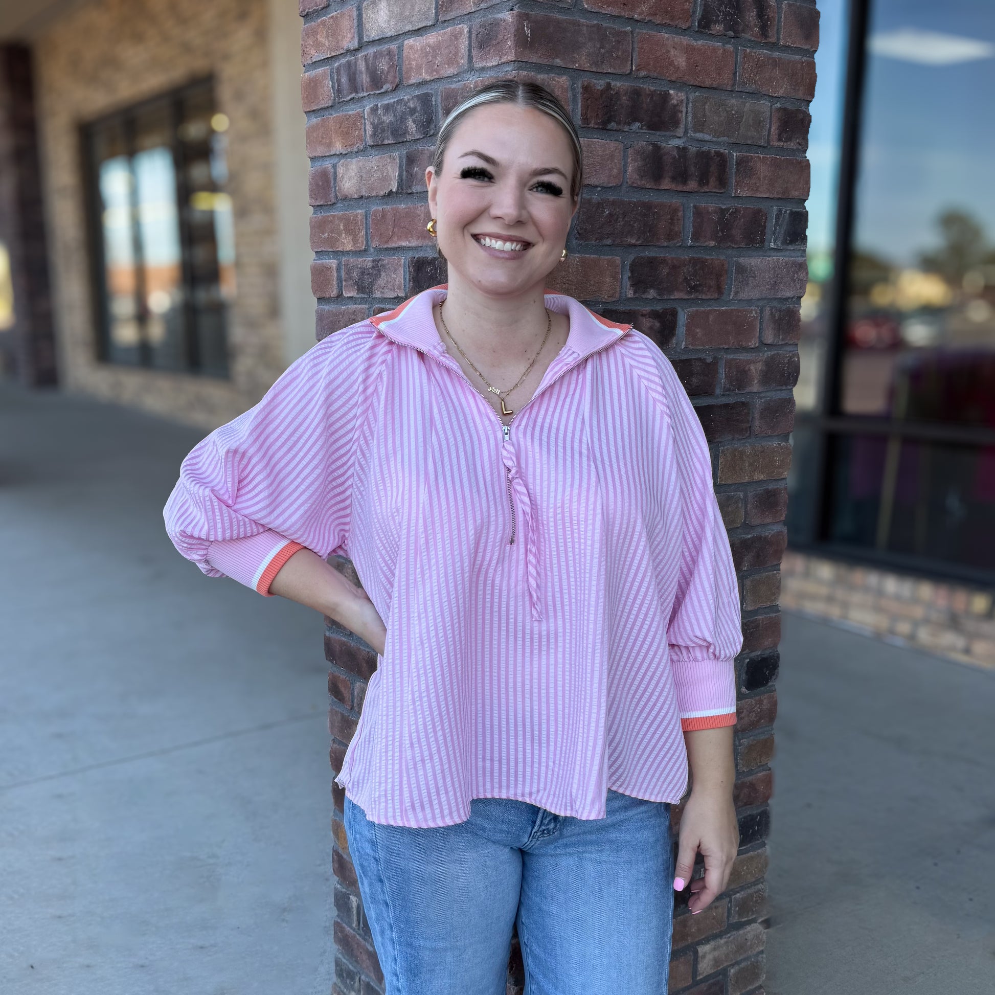 Stripes never looked so fun! This lightweight half-zip top features a playful mix of pretty pink stripes and vibrant orange accent that'll have you feeling bold and bright. The 3/4 sleeves hit just right for layering or going solo, while the relaxed fit keeps things comfy all day long. Perfect for anyone who loves a pop of color with their casual style.