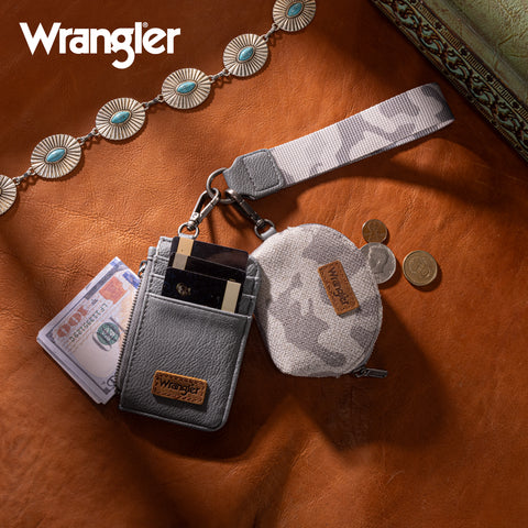 This Wrangler detachable dual pouch wristlet features a square wallet (card case) and a semi-circular coin purse and a wristlet. Available in Pink & Grey